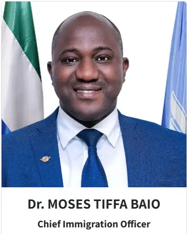 Dr. Moses Tiffa Baio has been appointed by His Excellency Dr. Julius Maada Bio as Chief Immigration Officer (CIO) of the Sierra Leone Immigration Department following a recent announcement on Friday 7th March 2025.